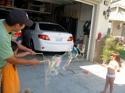 Next came our family fun evening. It was inspired by this post from Frugal Family Fun. Daniel went to Home Depot to get a dowel, which he sawed into 4 smaller dowels and some eye hooks to make these giant bubble wands: